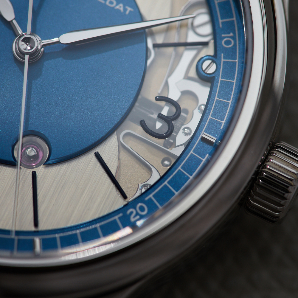 The dial is Made by Comblémine: sapphire, sand blasted, hand polished bevels.